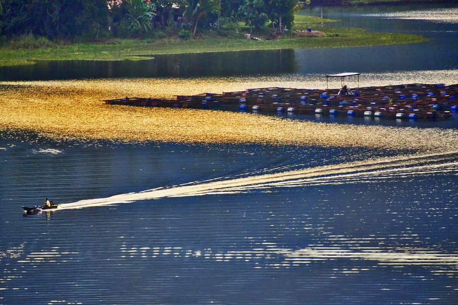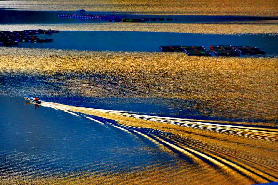湖面养鱼场周边金波闪烁,快艇直线飞驰划过,景色美得如梦似幻!