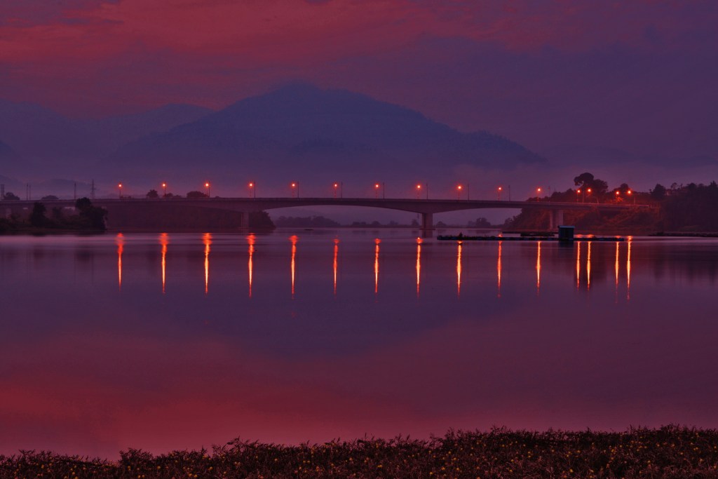 现任霹雳州苏丹纳斯林莎当年担任王储为拉班湖大桥主持开幕,以其名命名的纳斯林莎大桥,早晨灯光明亮,照耀湖面 ,灯光倒影,煞是美丽!