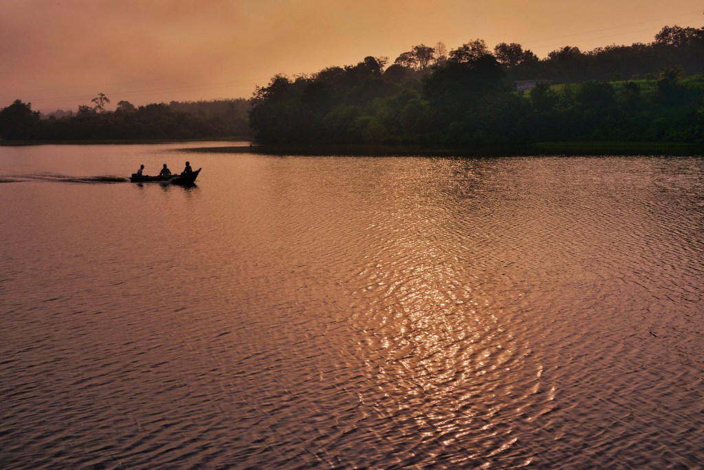 拉班湖湖光山色美如画,渔夫乘小船在湖中捕鱼,呈现一片如诗如画的景象。