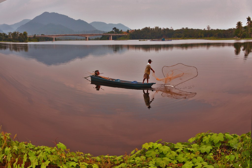 渔夫在美得令人着迷的拉班湖撒网捕鱼。