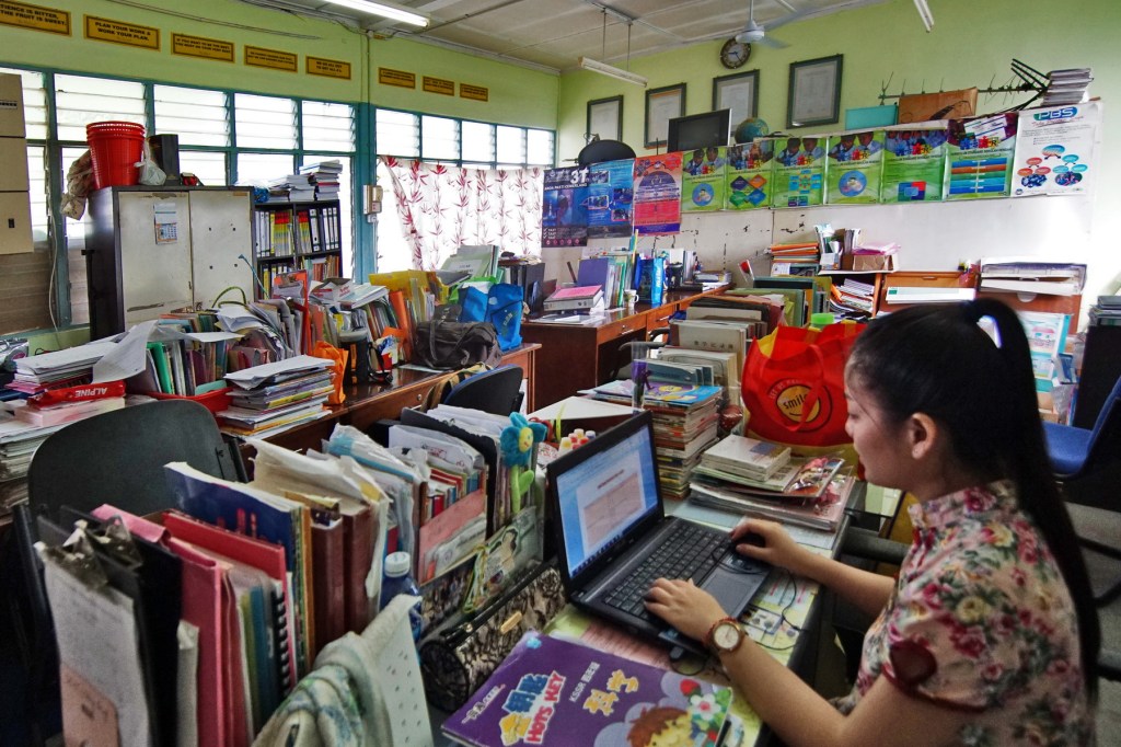 黄配仪副校长在教师办公室处理学校事务。