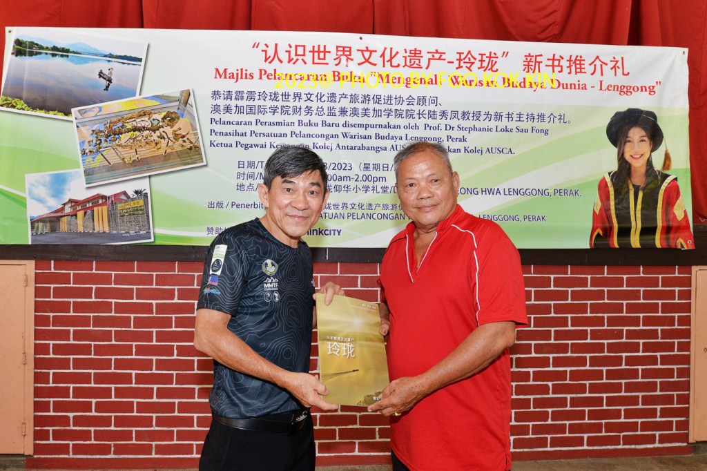 霹雳玲珑世界文化遗产旅游促进协会副主席黄天式(左)赠送新书给玲珑巴登古鲁华小校长王文尊(右)。